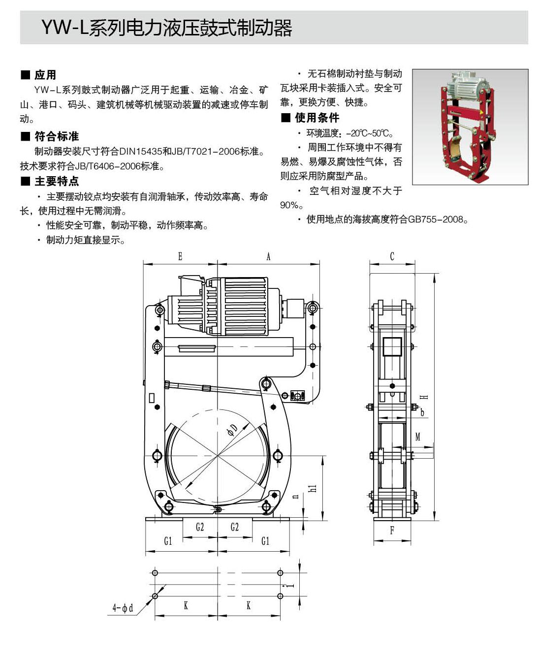 YW-L系列制動(dòng)器連接尺寸及制動(dòng)力矩參數(shù)符合JB/T6406-2006標(biāo)準(zhǔn)和DIN15435標(biāo)準(zhǔn)。配套符合DIN15430標(biāo)準(zhǔn)的Ed系列推動(dòng)器。