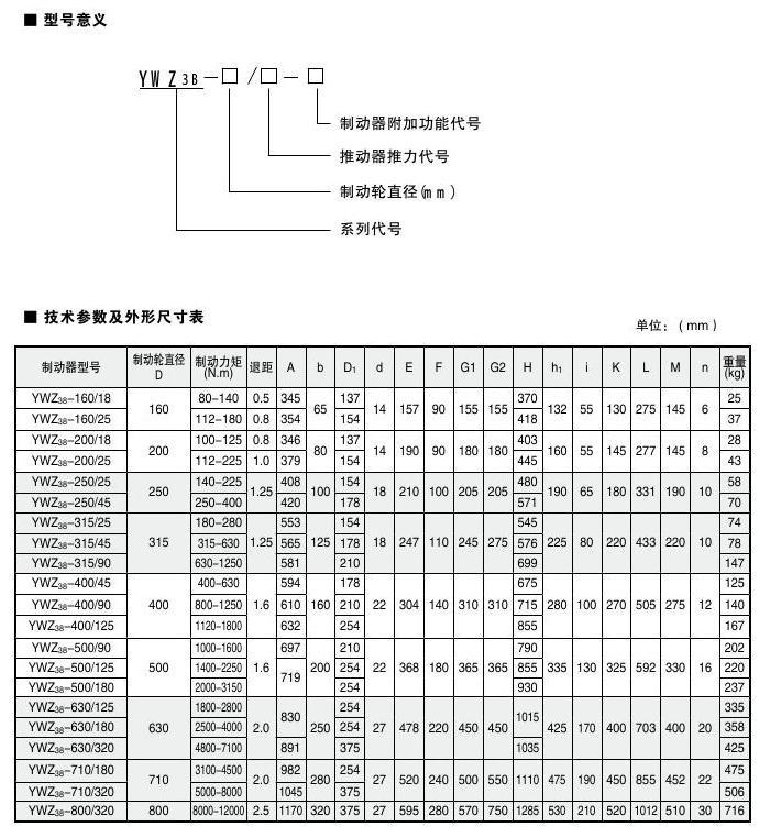 YWZ3B系列電力液壓鼓式制動器的連接尺寸和制動力矩參數符合GB6333-86標準,技術要求符合JB / T6406-2006標準, 本系列取代原YWZ3系列制動器。